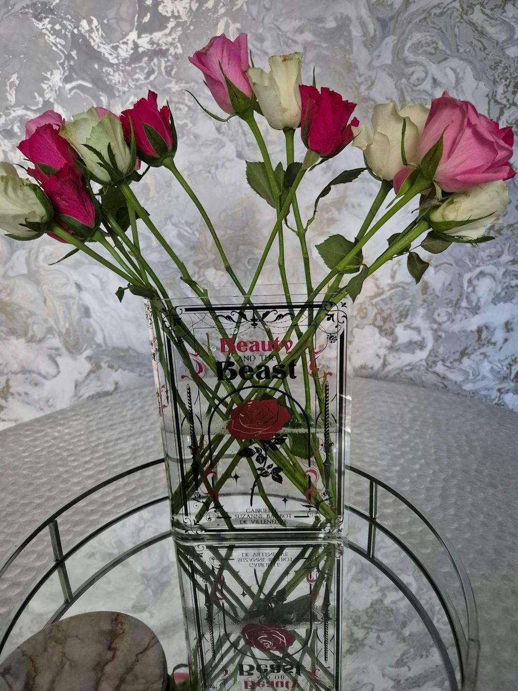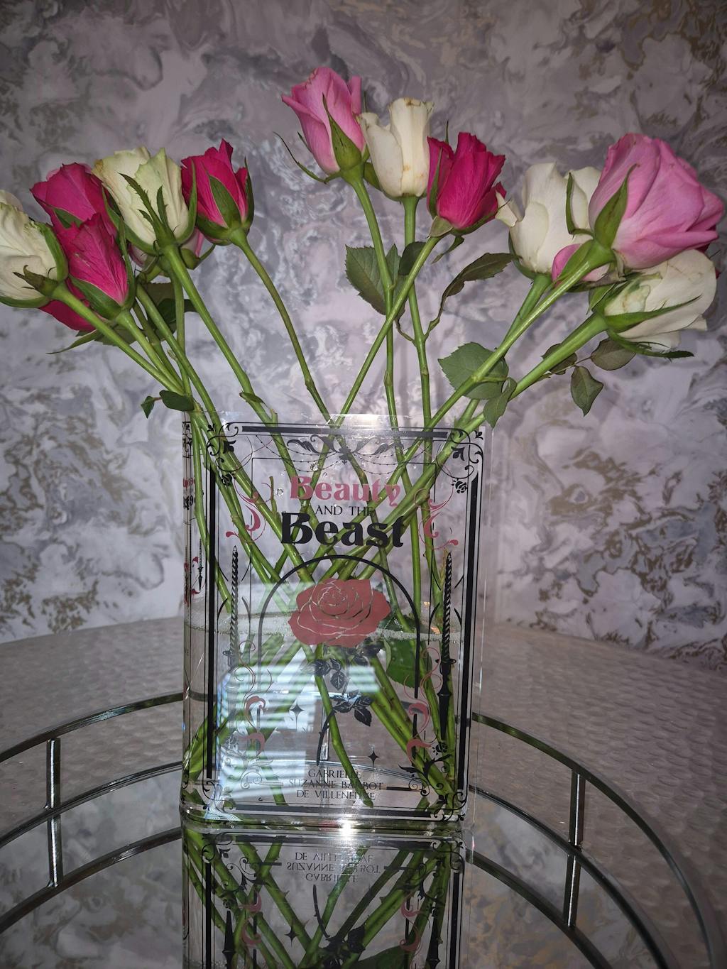 I purchased the acrylic beauty and the beast vase and it is more gorgeous in person. I can't wait to give it my daughter for her birthday as she is going to love it.
