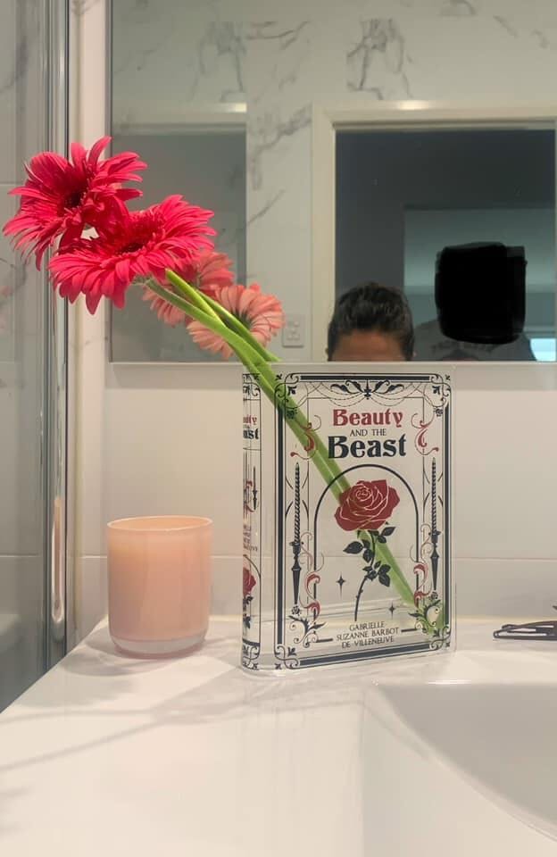 Acrylic book vase inspired by Beauty and the Beast. Unique book decor and literary gift for book lovers. Comes in a premium, Gift-Ready Box.
