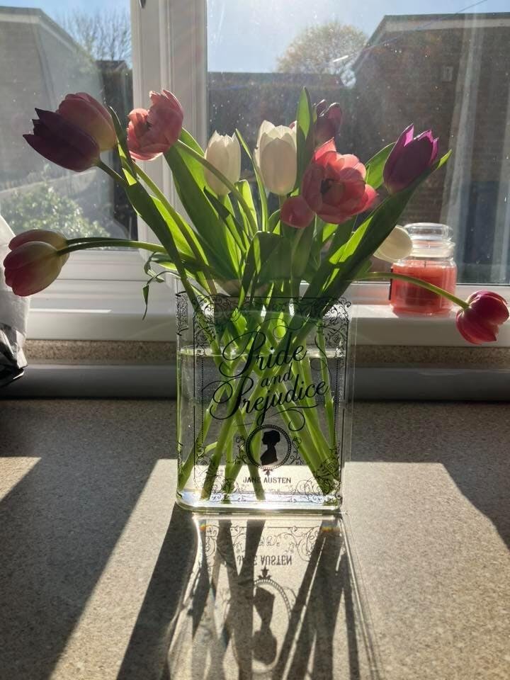 Acrylic book vase inspired by Pride and Prejudice. Unique book decor and literary gift for book lovers. Comes in a premium, Gift-Ready Box.