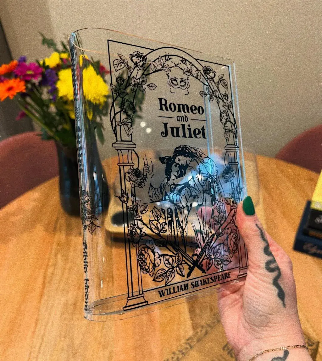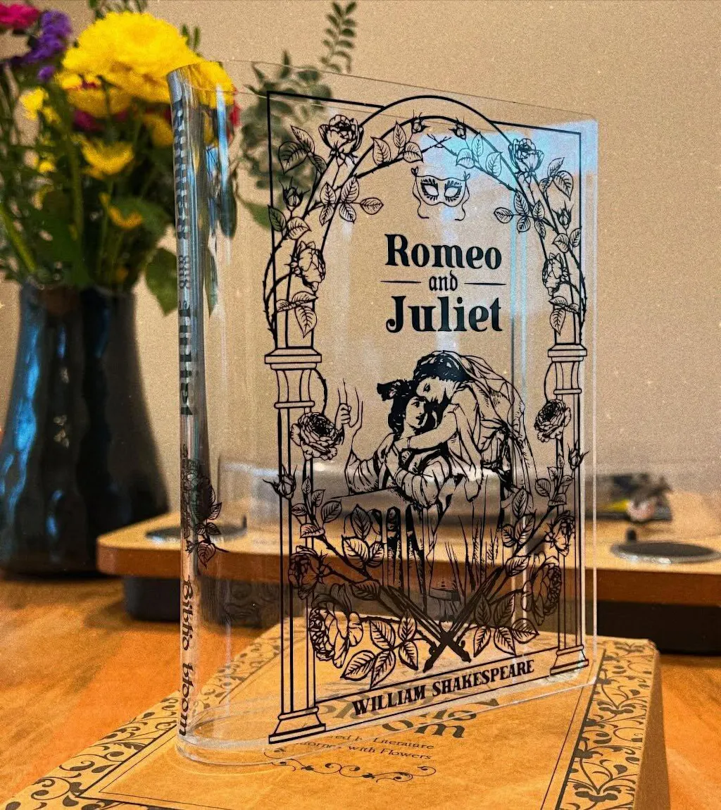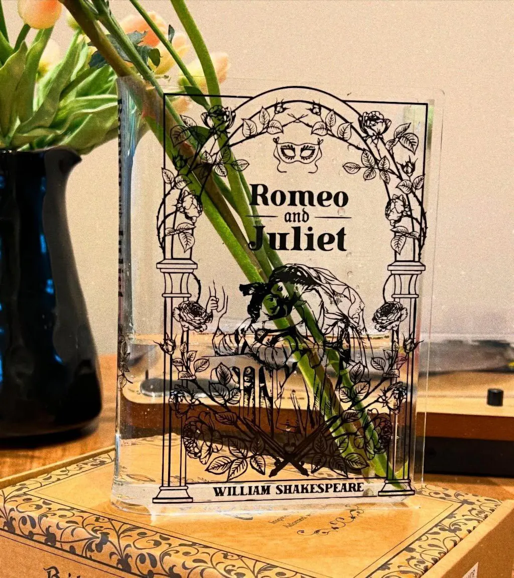 Acrylic book vase inspired by Romeo and Juliet. Unique book decor and literary gift for book lovers. Comes in a premium, Gift-Ready Box.