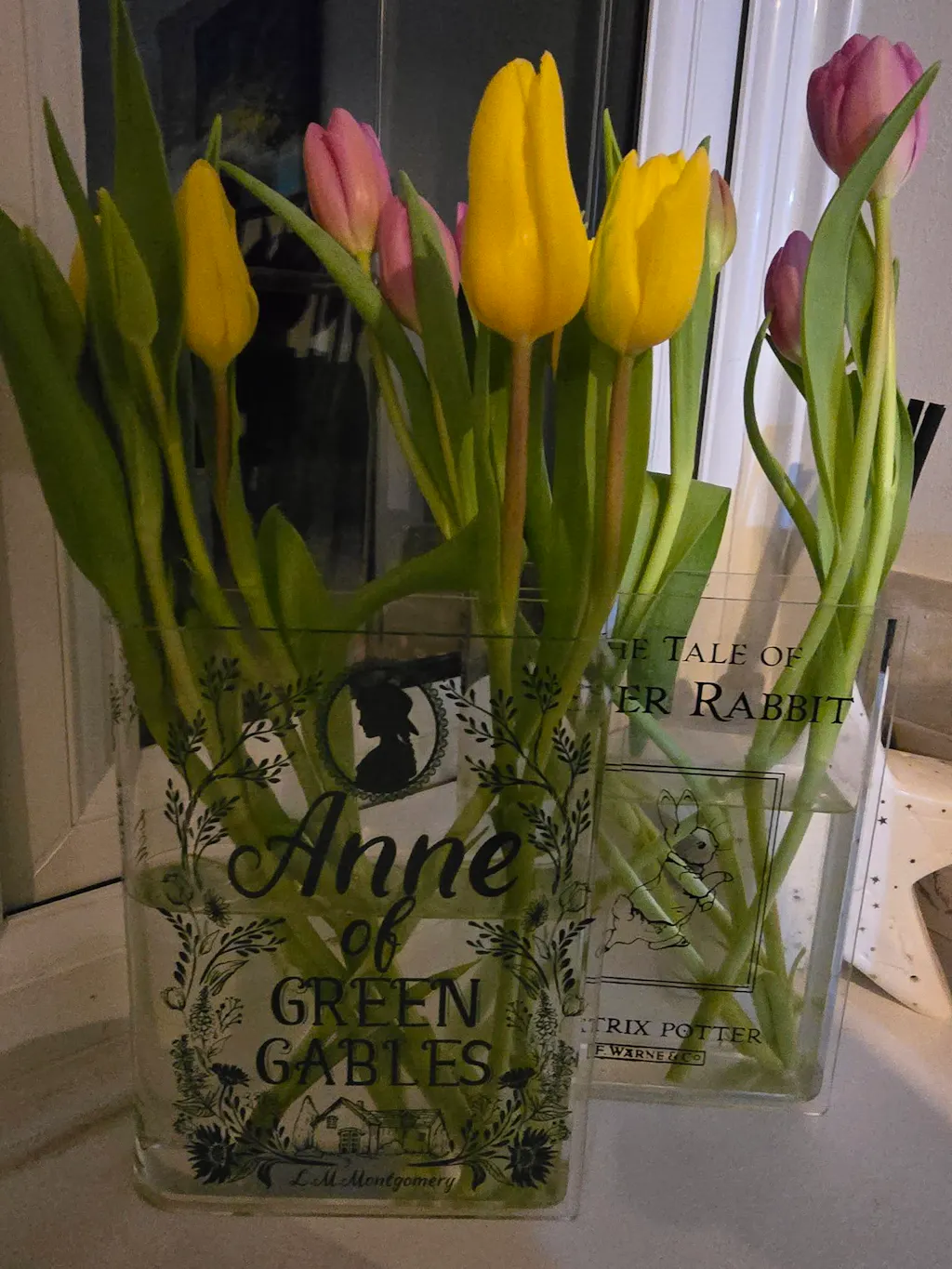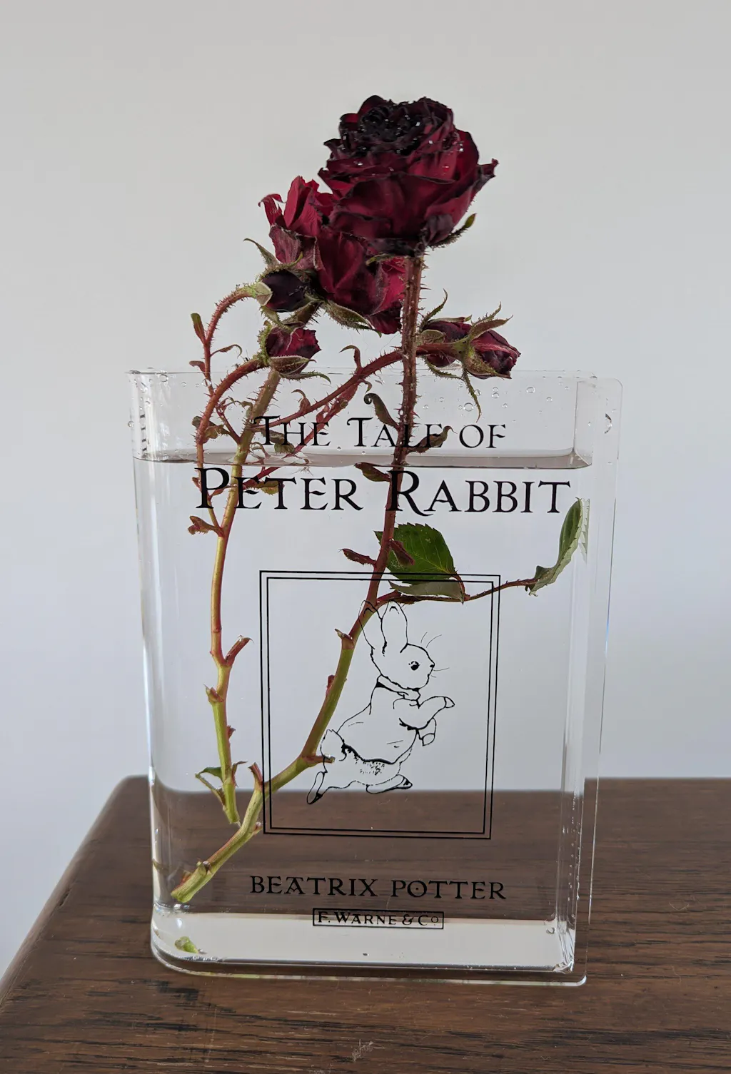 Acrylic book vase inspired by The Tale of Peter Rabbit. Unique book decor and literary gift for book lovers. Comes in a premium, Gift-Ready Box.